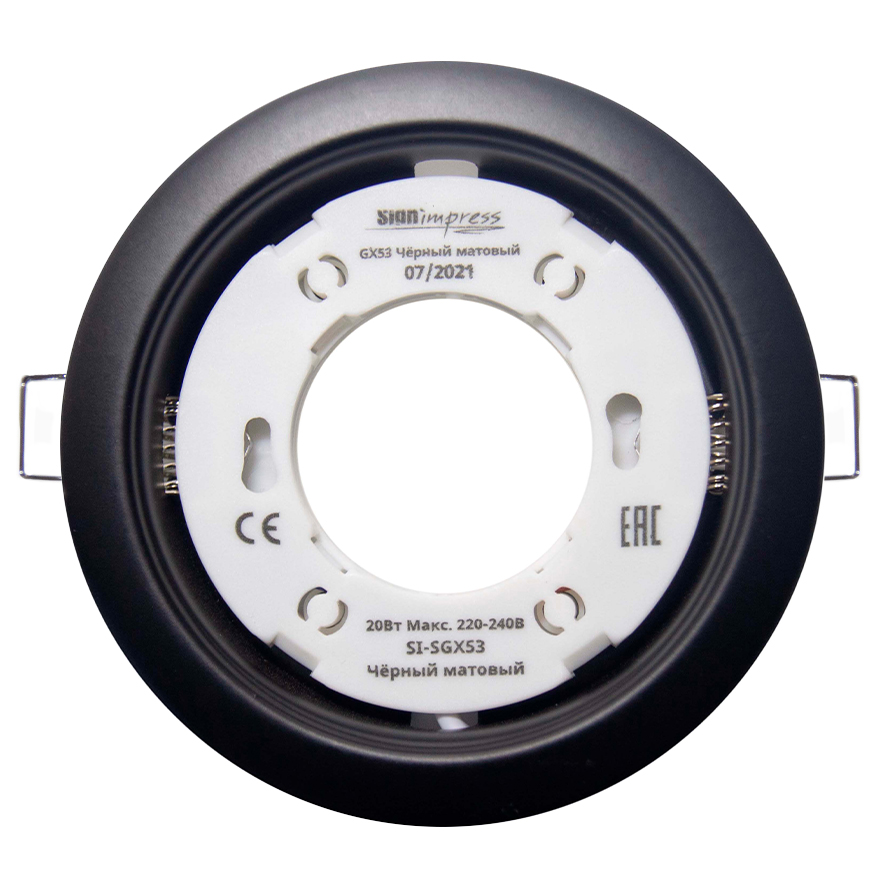 Светильник встраиваемый GX53 Чёрный матовый SignImpress с плоским патроном (который производится из материалов диэлектриков) оснащенным двумя прорезями и контактами для штырьков лампы, которые вводят в патрон и проворачивают до упора. Металлический корпус с защитно-декоративным покрытием из качественных материалов. Провод по ГОСТ, без занижения сечения. Продуманная конструкция патрона, позволяет использовать лампы с отклонениями от размеров и обеспечивает замену лампы без проблем и надежный эл. контакт. Пружинные лапы оптимальны и удобны в монтаже и демонтаже, исключено повреждение потолка. Cветильник предназначен для освещения административных, офисных и жилых помещений. Рассчитан для работы с лампами цоколя GX53. Так же устанавливается совместно с протекторным кольцом. Особенности и преимущества – небольшая глубина встраивания; цоколь GX53 позволяет получить равномерное освещение сравнительно большой площади; широкая сфера применения; доступность. Гарантия – 1год