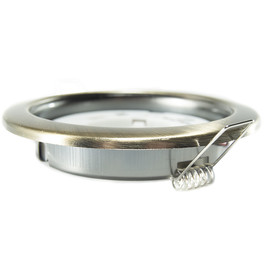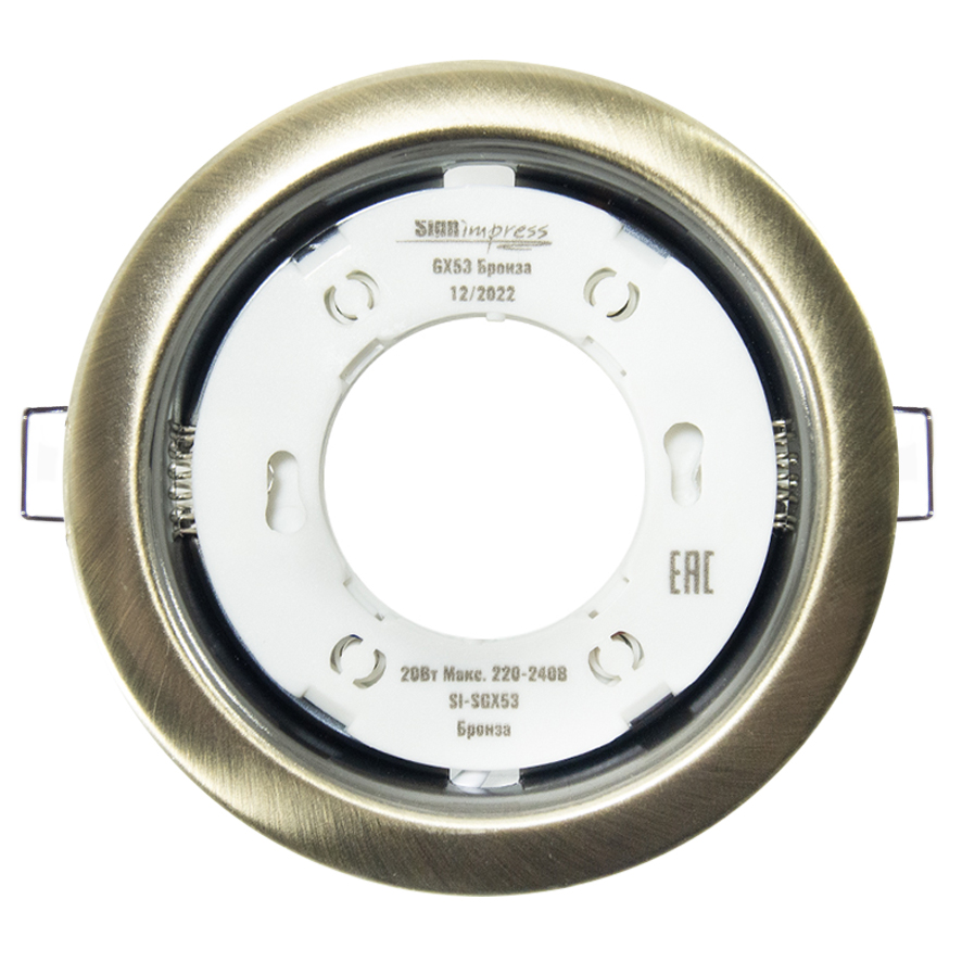 Светильник встраиваемый GX53 Бронза SignImpress с плоским патроном (который производится из материалов диэлектриков) оснащенным двумя прорезями и контактами для штырьков лампы, которые вводят в патрон и проворачивают до упора. Металлический корпус с защитно-декоративным покрытием из качественных материалов. Провод по ГОСТ, без занижения сечения. Продуманная конструкция патрона, позволяет использовать лампы с отклонениями от размеров и обеспечивает замену лампы без проблем и надежный эл. контакт. Пружинные лапы оптимальны и удобны в монтаже и демонтаже, исключено повреждение потолка. Cветильник предназначен для освещения административных, офисных и жилых помещений. Рассчитан для работы с лампами цоколя GX53. Так же устанавливается совместно с протекторным кольцом. Особенности и преимущества – небольшая глубина встраивания; цоколь GX53 позволяет получить равномерное освещение сравнительно большой площади; широкая сфера применения; доступность. Гарантия – 1год