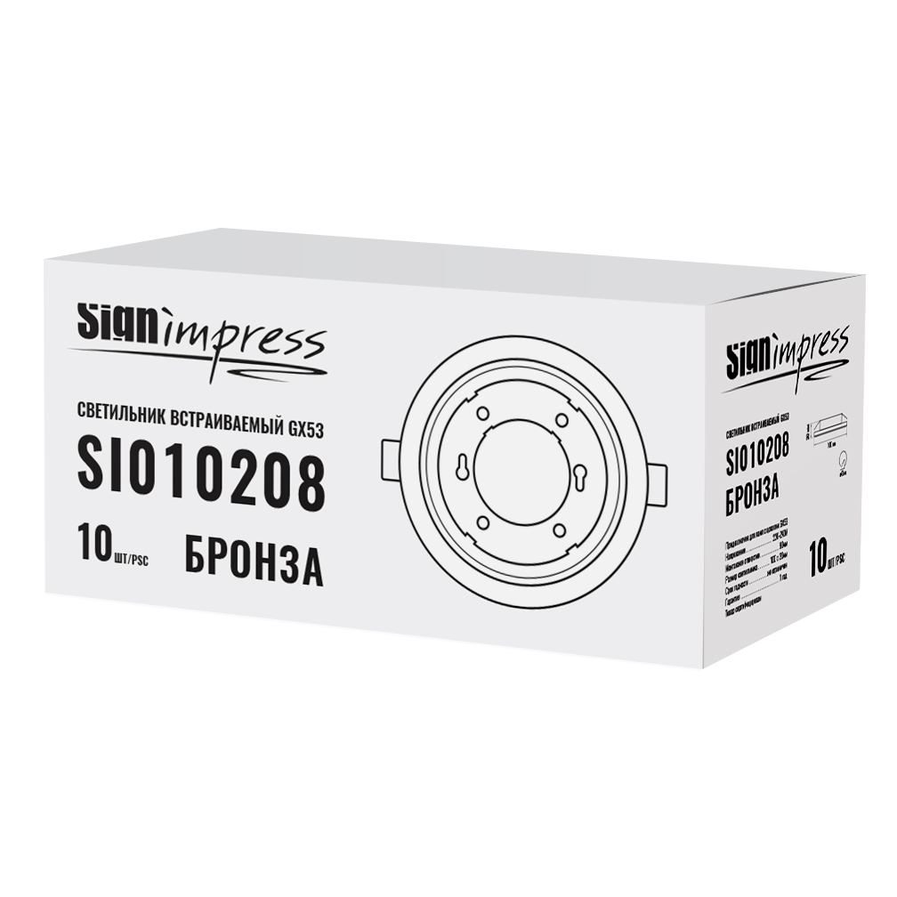 Светильник встраиваемый Бронза GX53 (под кольцо 85мм) SignImpress предназначен для использования с лампой светодиодной, цоколь GX53, для освещения жилых и общественных помещений. Подходит для подвесных конструкций. Комплектация: Светильник встраиваемый – 10 шт.; Паспорт изделия и руководство по эксплуатации – 1 шт.; Упаковка с характеристиками – 1 шт. Гарантия 1 год.
