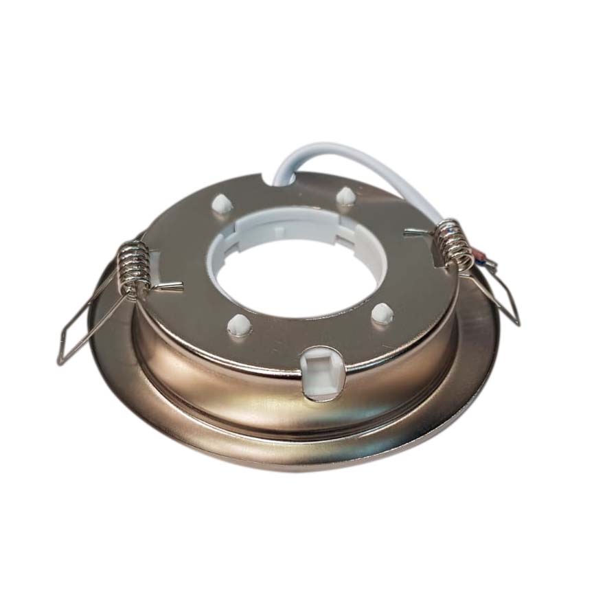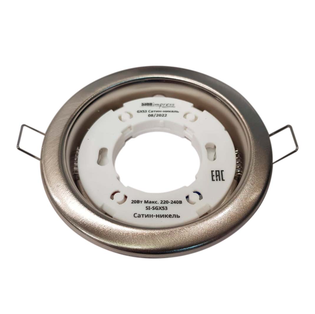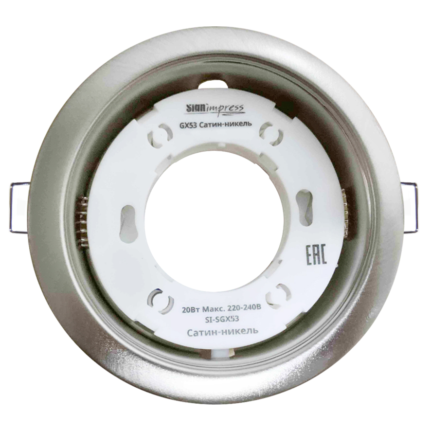 Светильник встраиваемый GX53 Сатин-никель SignImpress с плоским патроном (который производится из материалов диэлектриков) оснащенным двумя прорезями и контактами для штырьков лампы, которые вводят в патрон и проворачивают до упора. Металлический корпус с защитно-декоративным покрытием из качественных материалов. Провод по ГОСТ, без занижения сечения. Продуманная конструкция патрона, позволяет использовать лампы с отклонениями от размеров и обеспечивает замену лампы без проблем и надежный эл. контакт. Пружинные лапы оптимальны и удобны в монтаже и демонтаже, исключено повреждение потолка. Cветильник предназначен для освещения административных, офисных и жилых помещений. Рассчитан для работы с лампами цоколя GX53. Так же устанавливается совместно с протекторным кольцом. Особенности и преимущества – небольшая глубина встраивания; цоколь GX53 позволяет получить равномерное освещение сравнительно большой площади; широкая сфера применения; доступность. Гарантия – 1год