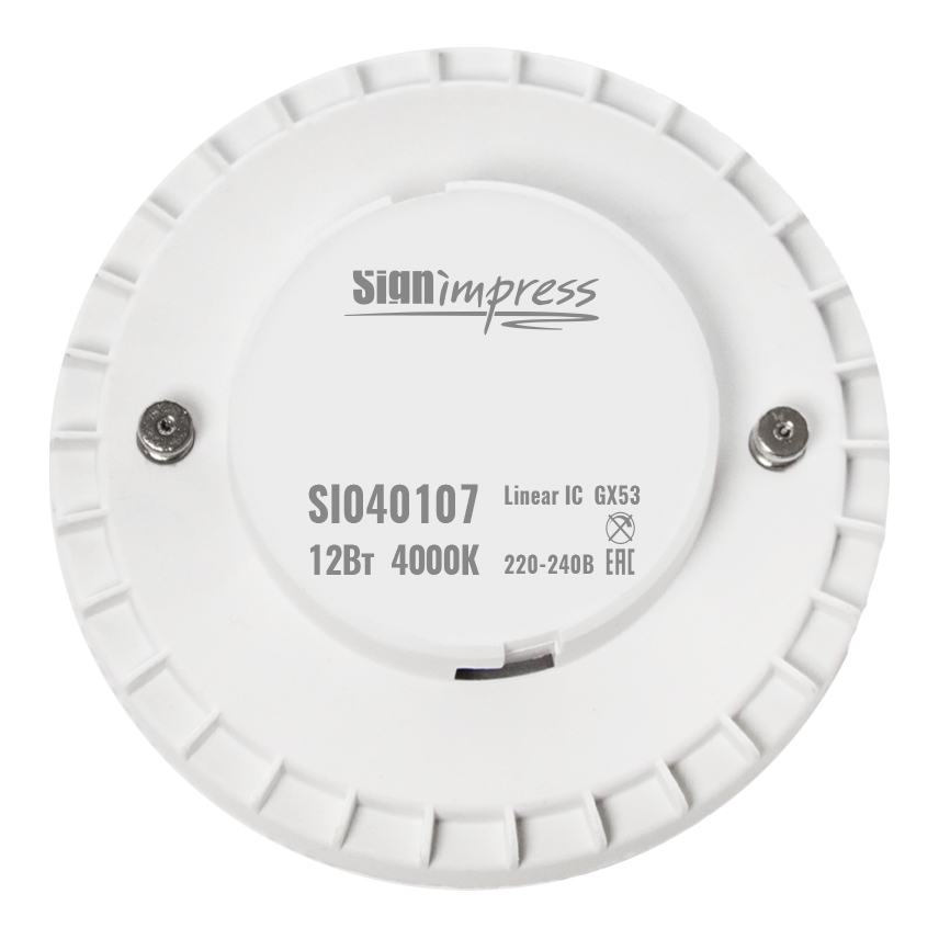 марки SignImpress. Комплектация: Лампа светодиодная с цоколем GX53 – 1 шт.; Паспорт изделия и руководство по эксплуатации – 1 шт.; Индивидуальная упаковка с характеристиками – 1 шт. Гарантия 2 года.