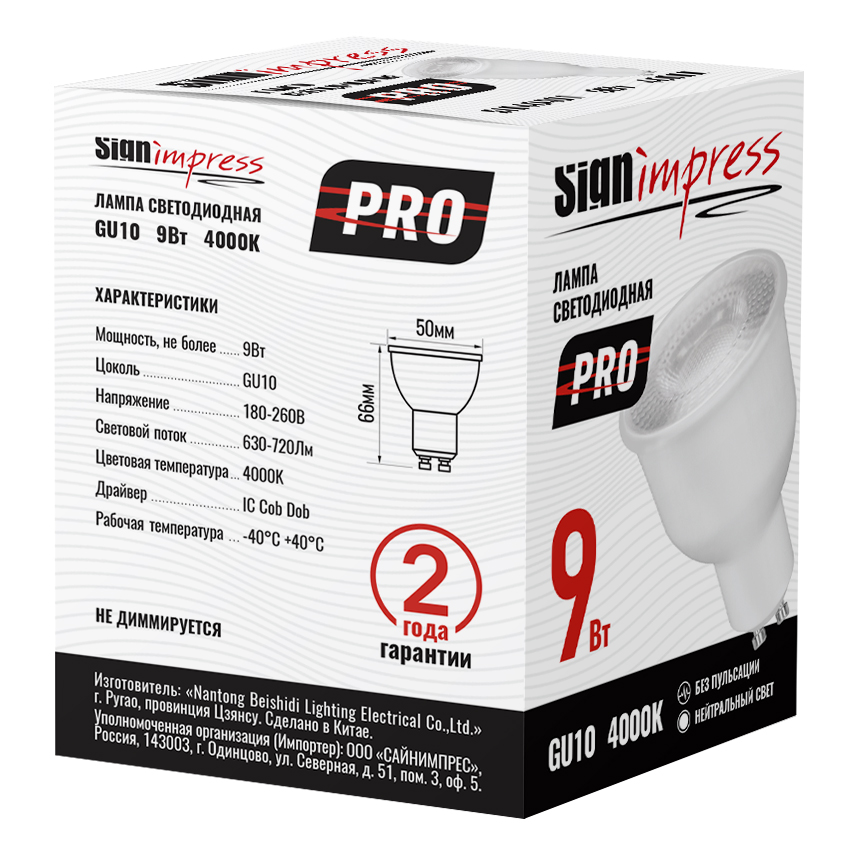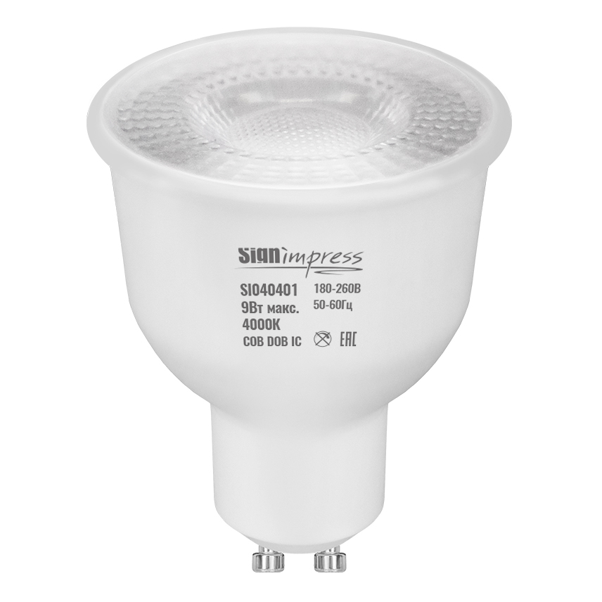 Лампа светодиодная GU10 PRO 9Вт 4000К DC IC угол рассеивания 38 SignImpress предназначена для использования со встраиваемым светильником типа GU10, который устанавливается в натяжных и подвесных потолках. Комплектация: Лампа светодиодная GU10 – 1 шт.; паспорт изделия и руководство по эксплуатации – 1 шт.; Индивидуальная упаковка с характеристиками – 1 шт. Гарантия 2 года.