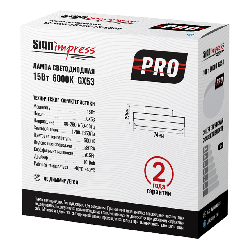 марки SignImpress. Комплектация: Лампа светодиодная с цоколем GX53 – 1 шт.; Паспорт изделия и руководство по эксплуатации – 1 шт.; Индивидуальная упаковка с характеристиками – 1 шт. Гарантия 2 года.