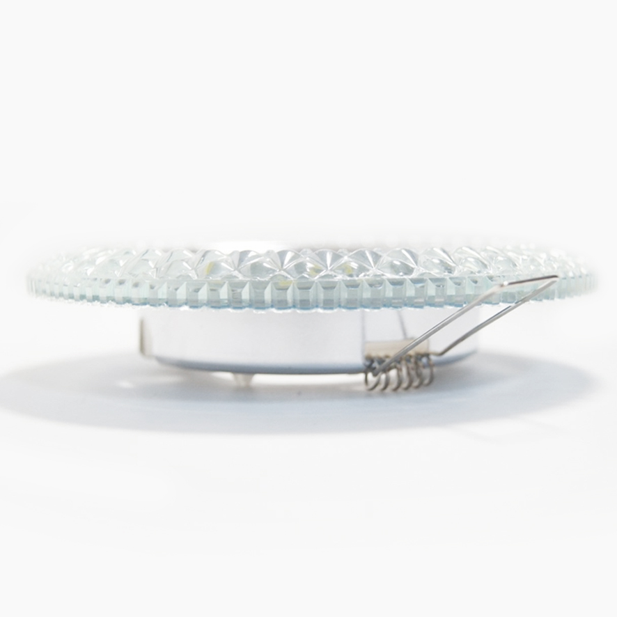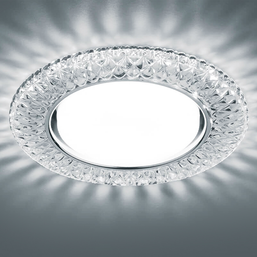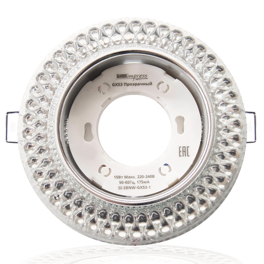 Светильник встраиваемый с подсветкой SI-SBNW-GX53-1 Прозрачный SignImpress с плоским патроном (который производится из материалов диэлектриков) оснащенным двумя прорезями и контактами для штырьков лампы, которые вводят в патрон и проворачивают до упора. Провод по ГОСТ, без занижения сечения. Продуманная конструкция патрона, позволяет использовать лампы с отклонениями от размеров и обеспечивает замену лампы без проблем и надежный эл. контакт. Пружинные лапы оптимальны и удобны в монтаже и демонтаже, исключено повреждение потолка. Светильник предназначен для освещения административных, офисных и жилых помещений. Рассчитан для работы с лампами цоколя GX53. Также устанавливается совместно с протекторным кольцом. Особенности и преимущества – небольшая глубина встраивания; цоколь GX53 позволяет получить равномерное освещение сравнительно большой площади; широкая сфера применения; доступность. Гарантия – 1год. Комплектация:светильник без лампы; прозрачное кольцо; драйвер.