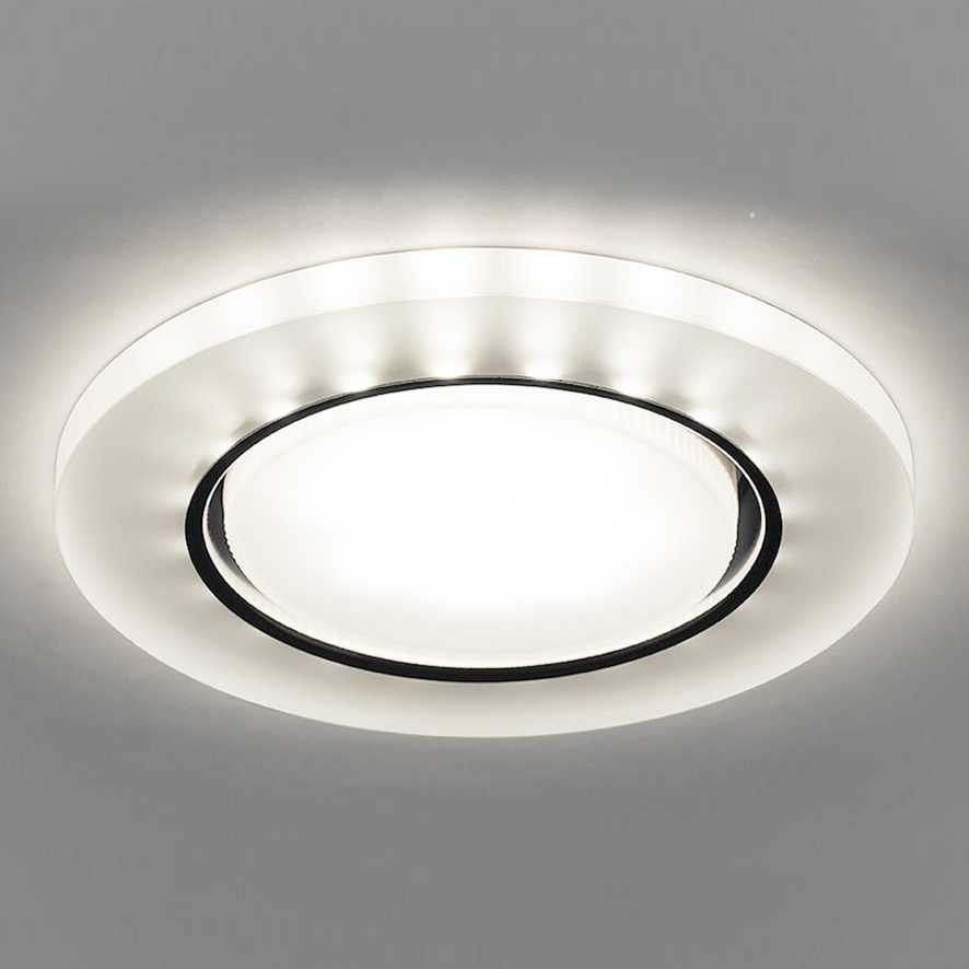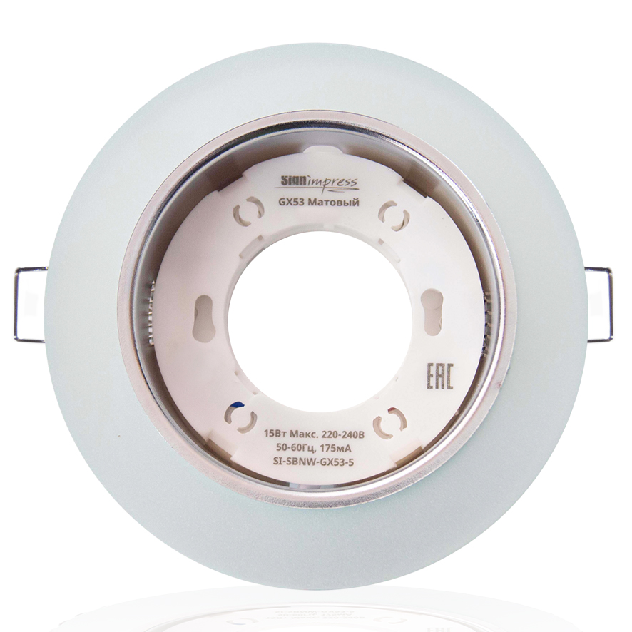 Светильник встраиваемый с подсветкой SI-SBNW-GX53-5 Матовый белый SignImpress с плоским патроном (который производится из материалов диэлектриков) оснащенным двумя прорезями и контактами для штырьков лампы, которые вводят в патрон и проворачивают до упора. Провод по ГОСТ, без занижения сечения. Продуманная конструкция патрона, позволяет использовать лампы с отклонениями от размеров и обеспечивает замену лампы без проблем и надежный эл. контакт. Пружинные лапы оптимальны и удобны в монтаже и демонтаже, исключено повреждение потолка. Светильник предназначен для освещения административных, офисных и жилых помещений. Рассчитан для работы с лампами цоколя GX53. Также устанавливается совместно с протекторным кольцом. Особенности и преимущества – небольшая глубина встраивания; цоколь GX53 позволяет получить равномерное освещение сравнительно большой площади; широкая сфера применения; доступность. Гарантия – 1год. Комплектация:светильник без лампы; прозрачное кольцо; драйвер.