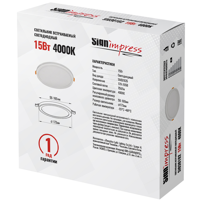 Светильник светодиодный регулируемый круг (до 160мм) 15Вт 4000K 750Лм SignImpress Светильник встраеваемый светодиодный с возможностью изменения монтажного диаметра предназначен для освещения жилых и общественных помещений, который устанавливается в натяжных и подвесных потолках. Механизм регулировки монтажного диаметра позволяет решить проблему несовпадения диаметра установочного отверстия при замене одних светильников на другие. Механизм регулировки монтажного диаметра избавит от дополнительных затрат на дополнительные монтажные работы, сэкономит время на подборе аналогов в заданных размерах. Светильник обладает плоской формой с эстетическим ободом по краю. Светильник встраиваемый светодиодный является одним из самых экологически чистых товаров. Комплектация: Светильник встраиваемый светодиодный с возможностью изменения монтажного диаметра – 1шт.; Драйвер – 1шт.; Технический паспорт и руководство по эксплуатации - 1шт.; Индивидуальная коробка с характеристиками – 1шт. Гарантия 1 год.