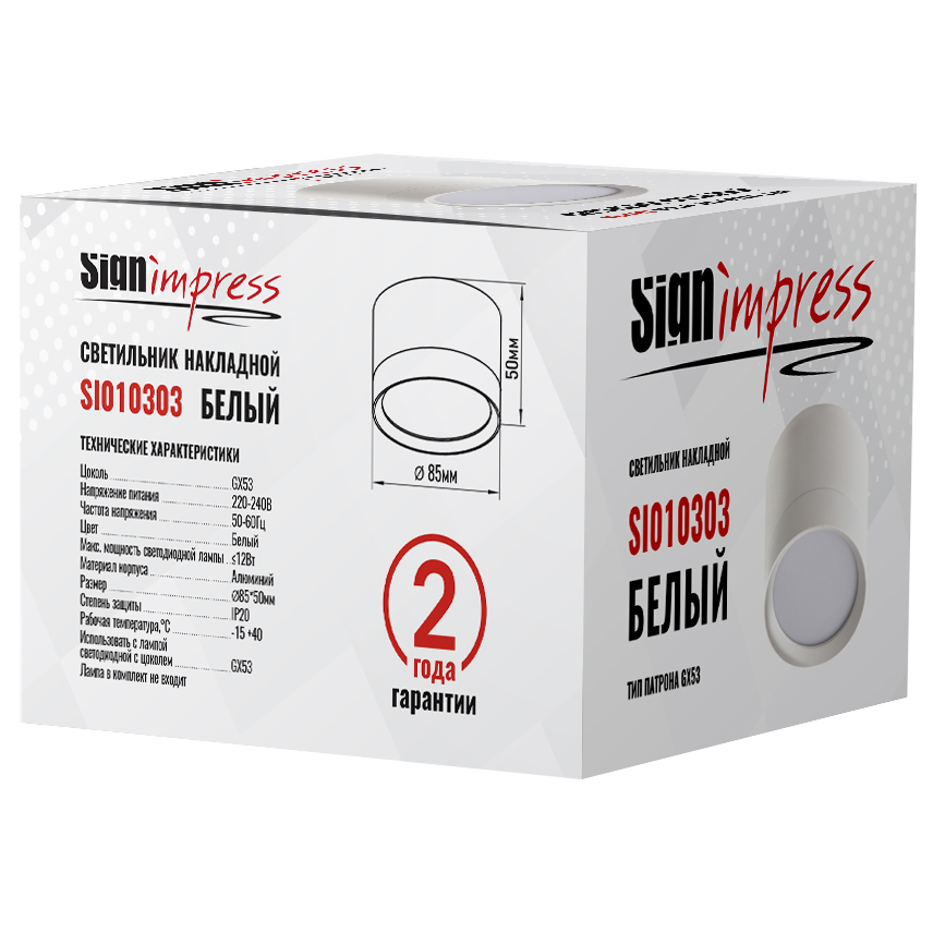 Светильник накладной под лампу GX53 010303 Белый SignImpress предназначен для освещения жилых и общественных помещений, которые устанавливаются в натяжной или подвесной потолок.