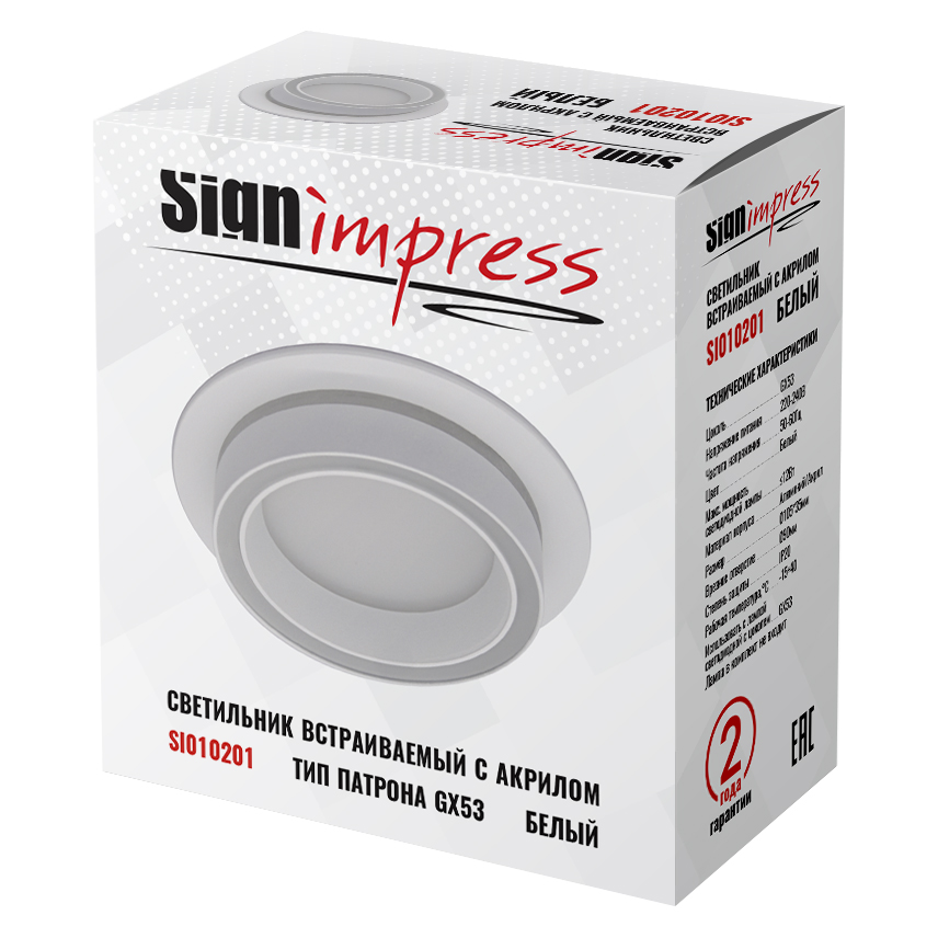 Светильник встраиваемый GX53 с акрилом круглый 010201 Белый SignImpress Светильник встраеваемый металлический предназначен для использования со светодиодной лампой, цоколь GХ53, для освещения жилых и общещественных помещений.Подходит для подвесных конструкций. Рекомендуется использовать в комплекте с лампой светодиодной марки SignImpress. Светильник встраеваемый не содержат ртутьсодержащихся веществ, поэтому он не представляет опастности в случае выхода из строя или разрушения. Комплектация: Светильник встраеваемый - 1шт.; Паспорт изделия и руководство к эксплуатации - 1шт.; Упаковка с харрактеристиками - 1шт. Гарантия 2 года.