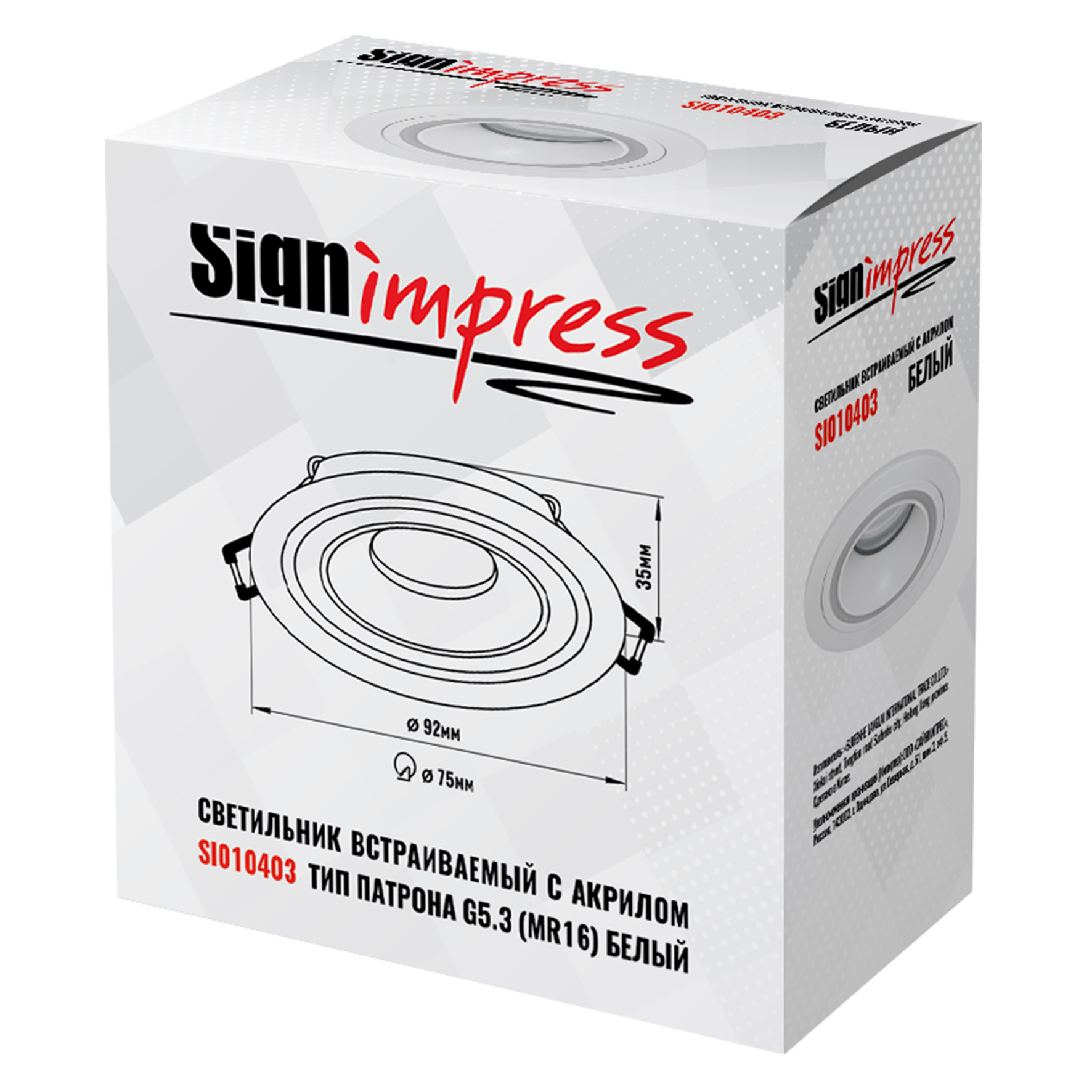 Светильник встраиваемый с акрилом G5.3 (MR16) круглый 010403 Белый SignImpress предназначен для использования с лампой светодиодной, цоколь G5.3 (MR16), для освещения жилых и общественных помещений. Подходит для подвесных конструкций. ВНИМАНИЕ: Рекомендуется использовать в комплекте с лампой светодиодной марки SignImpress. Комплектация: Светильник встраиваемый – 1 шт.; Патрон G5.3 (MR16) - 1шт.; Паспорт изделия и руководство по эксплуатации – 1 шт.; Упаковка с характеристиками – 1 шт. Гарантия 2 года.