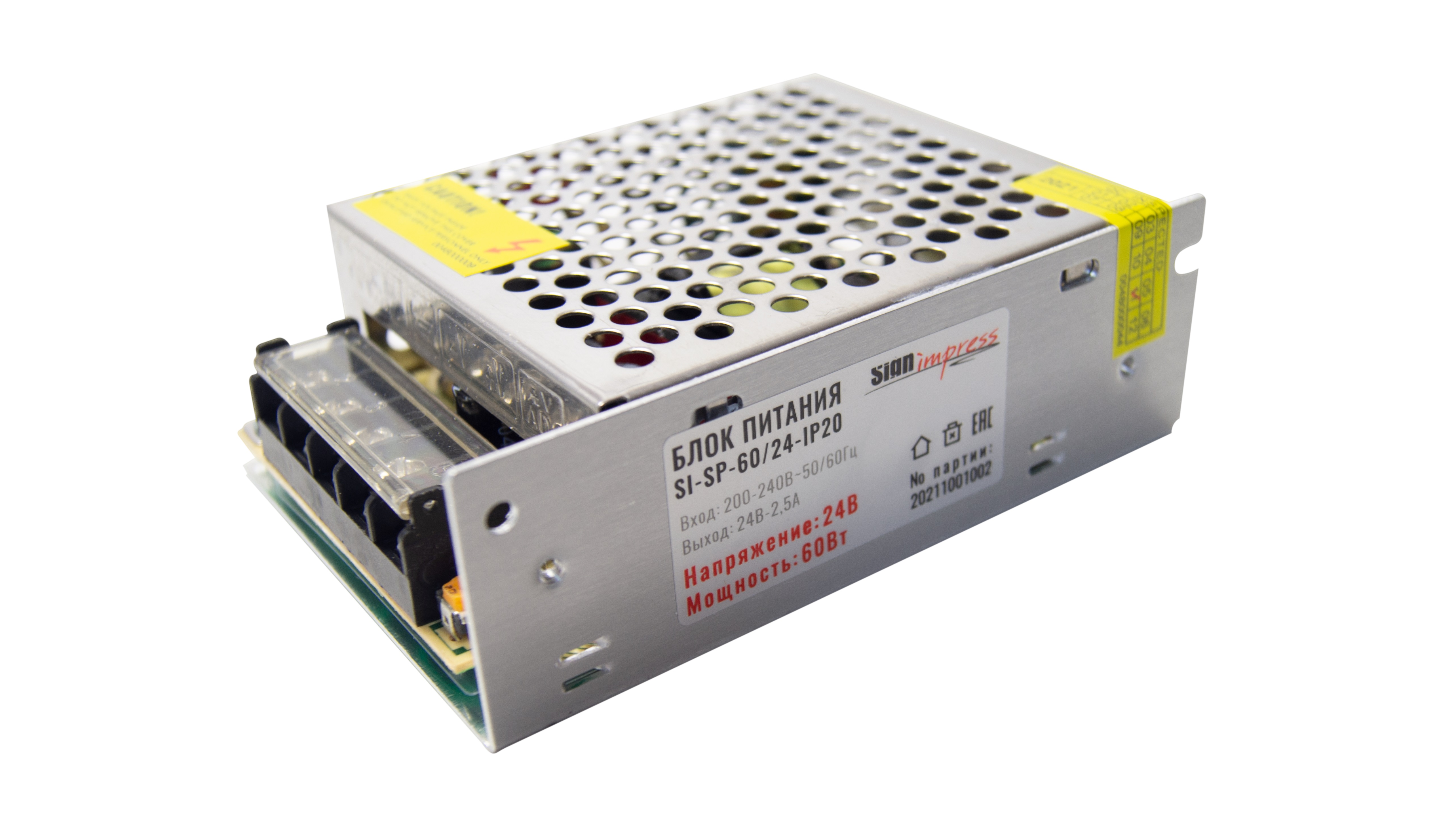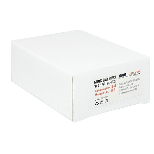 Блок питания 60W 24V IP20 SignImpress предназначен для преобразования переменного тока 220 вольт в постоянный ток 24 вольт. Имеет открытый невлагозащищенный корпус (степень защиты IP20), предназначен для установки в сухих местах, в помещениях или внутри изделий. В рекламной сфере используется для подключения светодиодных лент, модулей, кластеров, светодиодных линеек, пикселей и т.д. Также может быть использован и в других сферах для подключения 24-ти вольтового оборудования. При выборе блока питания рекомендуется предусматривать 20-25% запас по мощности. Гарантия 2 года. Комплектация: блок питания.