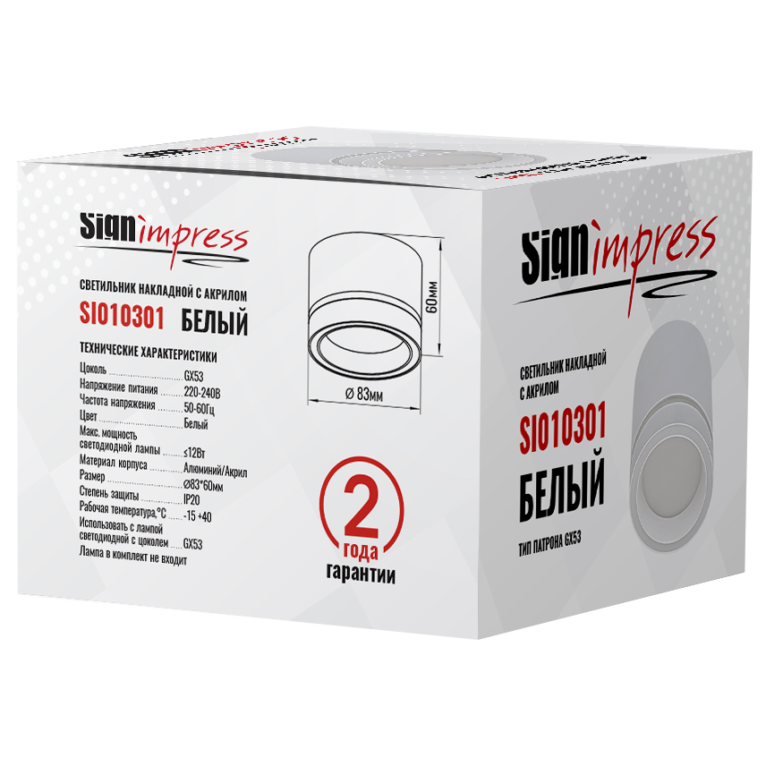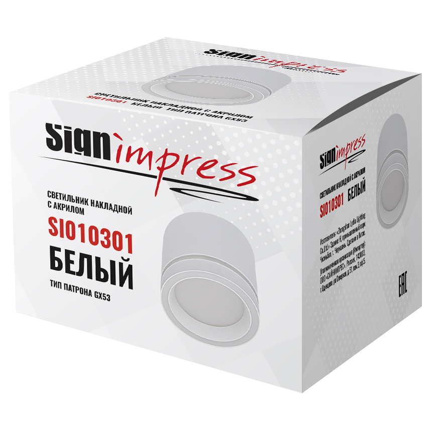 Светильник накладной под лампу GX53 с акрилом 010301 Белый SignImpress Светильник накладной предназначен для освещения жилых и общественных помещений, которые устанавливаются в натяжной или подвесной потолок. Светильник необходимо использовать с лампой светодиодной, цоколь GX53. Светильник накладной не содержит ртутьсодержащих веществ, поэтому он не представляет опасности в случае выхода из строя или разрушения.