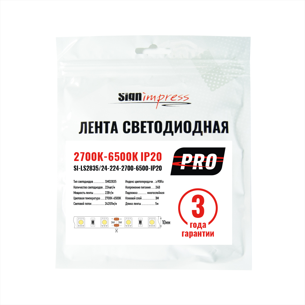 Лента светодиодная SMD2835 24В 224д/м 22Вт 2700-6500К IP20 (1метр) SignImpress предназначена для реализации освещения в проектах, где есть потребность в высоком качестве света и долговечности источника света. Может быть с лёгкостью использована в качестве основного источника освещения в жилых и офисных помещениях, благодаря большим показателям светового потока, даже при условии установки светорассеивающего экрана поверх. Гарантия 3 года.