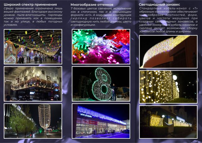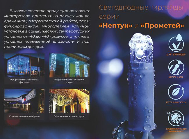 Светодиодная гирлянда "Прометей" (LI-100L-CC-F-B) 10м состоит из нити длиной 10 метров и светодиодов в количестве 100 штук. Особенностью гирлянды является использование цветного кабеля, который соответствует цвету свечения самих диодов и это обеспечивает эстетический вид в дневное время. Высокое качество и уникальность гирлянды «Прометей» позволит многоразово применять ее в оформительской работе как внутри помещения, так и в уличной установке в температурном режиме от -10 до +40 градусов, а также в условиях повышенной влажности. Модульная конструкция гирлянды позволяет собирать светодиодную нить любой длины, например, от 10 до 100 метров. Главной уникальной характеристикой гирлянды Прометей является то, что Цвет провода гирлянды - идет в цвет свечения диода. Гирлянда «Прометей» может быть исполнена как в статичном, так и в мерцающем формате.