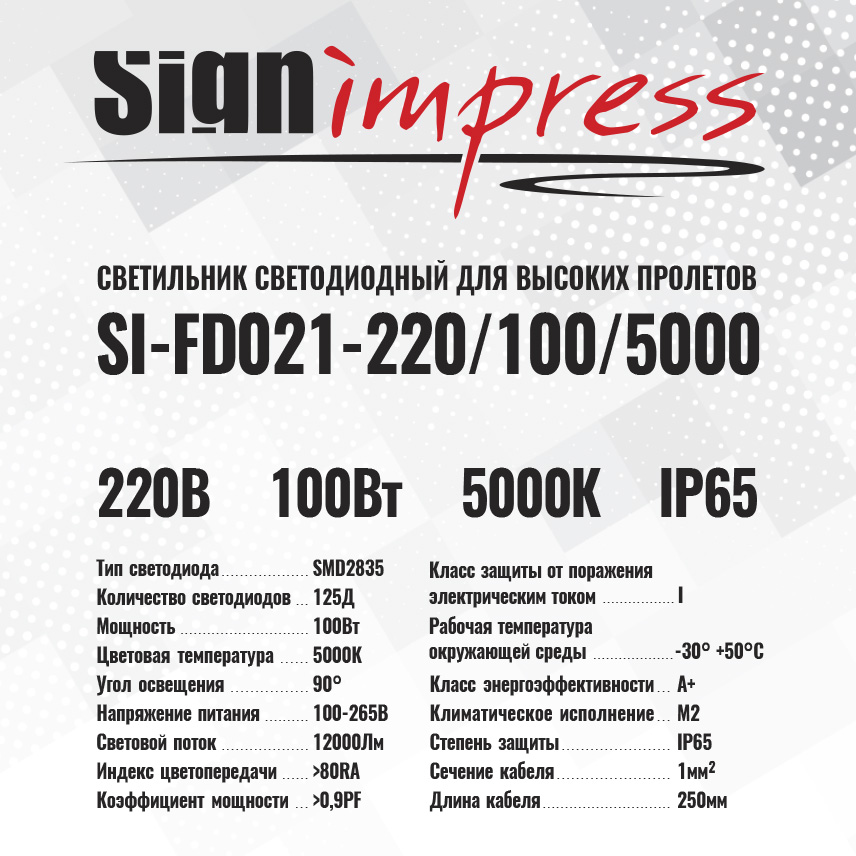 Светильники светодиодный для высоких пролетов FD021 220В 100Вт 5000К 125д 90гр IP65 SignImpress предназначен для решения широкого спектра задач по освещению открытых пространств, архитектурных объектов, торговых площадей, цехов, заводов, подсветки парковок, дворовых территорий, спортивных площадок, автостояно, рекламных конструкций, производственных и сельскохозяйственных комплексов, ангаров. Комплектация: Светильник светодиодный для высоких пролетов - 1шт.; Кольцо для крепления светильника- 1шт.; Цепь для крепления светильника - 1шт.; Технический паспорт и руководство к эксплуатации - 1шт.; Индивидуальная коробка с характеристиками - 1шт. Гарантия 2 года.