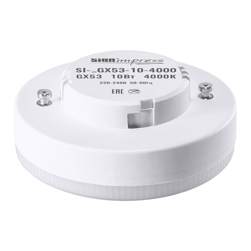 Лампа светодиодная GX53 10W 4000К SignImpress предназначена для применения в жилых помещениях и офисах. Используется для освещения в натяжных и подвесных потолках. Не имеют слепящего эффекта благодаря высококачественному рассеивателю и драйверу. Применяется для светильников с цоколем GX53. Достоинства ламп SignImpress: низкое потребление энергии (в 9-10 раз меньше, чем у ламп накаливания), не нагревается и не пульсирует, имеет пластиковый рассеиватель. Соответствие заявленным техническим характеристикам, в том числе потребляемой мощности и заявленному световому потоку. Гарантия 2 года.